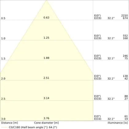 De gradenbundel geeft informatie over hoe breed het licht wordt uitgestraald. Dit zit tussen de 0 en 360 graden (D). Hoe kleiner de hoek, hoe specifieker de lichtbundel is. Over het algemeen is een smalle gradenbundel perfect voor sfeer- of accentverlichting, terwijl een brede gradenbundel ideaal is om grote oppervlaktes te verlichten.